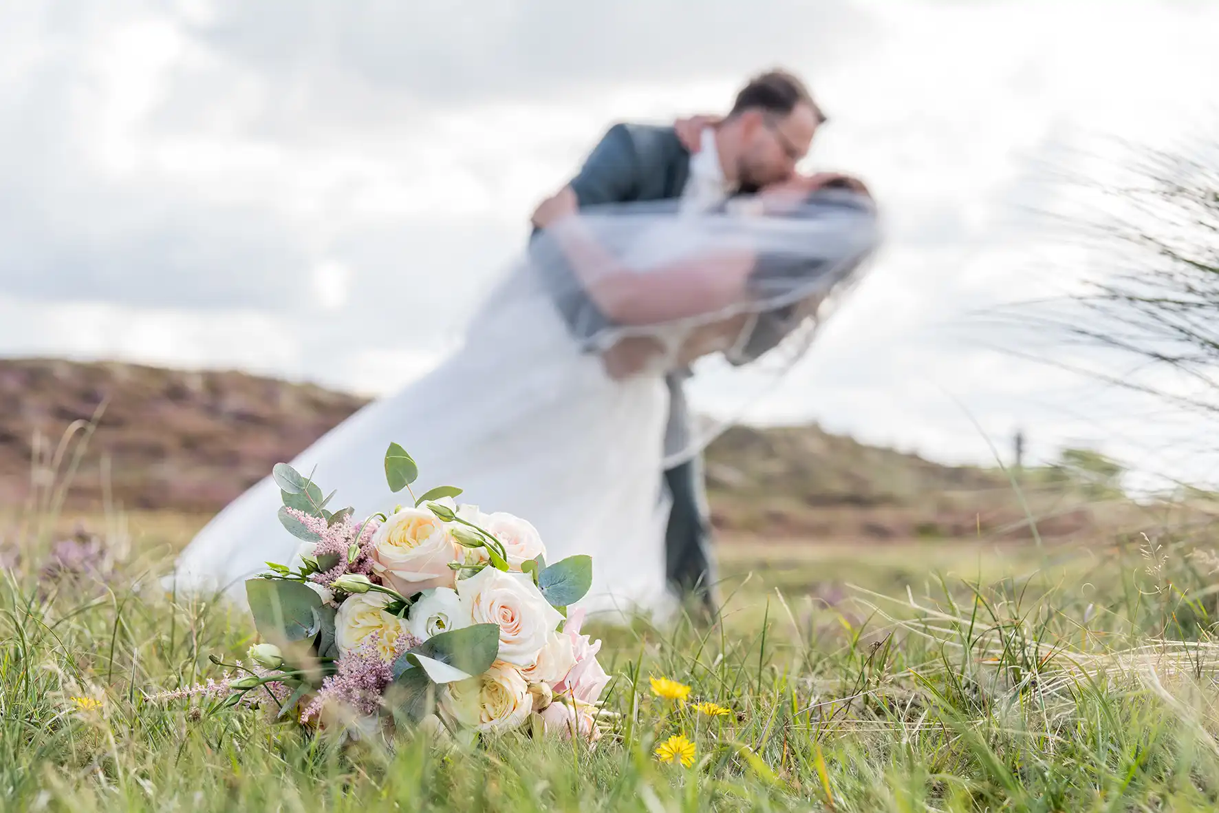 En ja, natuurlijk mocht de zee niet ontbreken. Met het uitzicht richting Texel kregen we een prachtige achtergrond cadeau. Er stond een zacht briesje dat zorgde voor speelse momenten: de jurk die net iets te eigenwijs wapperde, de sluier die vrolijk met de wind mee wilde dansen… en stiekem zijn dat vaak de foto’s die juist de meeste charme hebben.