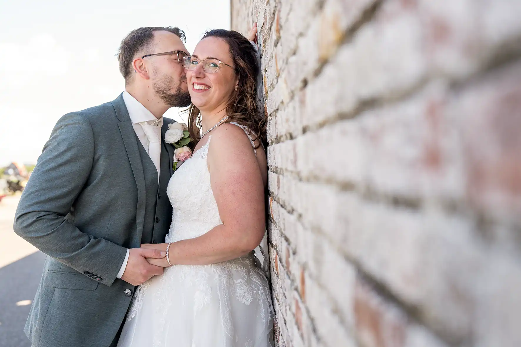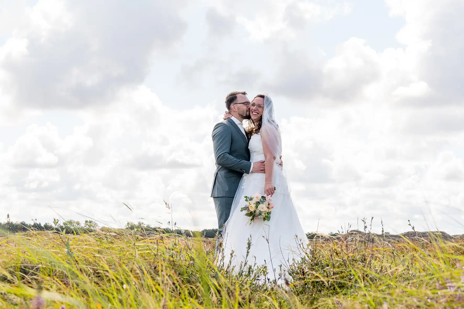 Voor de fotoshoot trokken we naar de duinen van Den Helder, een plek waar ik als bruidsfotograaf altijd blij van word. Vlakbij Fort Kijkduin begonnen we met een paar stoere foto’s rondom het oude fort, de combinatie van historische muren en een stralend bruidspaar blijft gewoon magisch. Daarna liepen we verder de duinen in, waar Debby en Ruan even écht de tijd namen om samen te genieten.