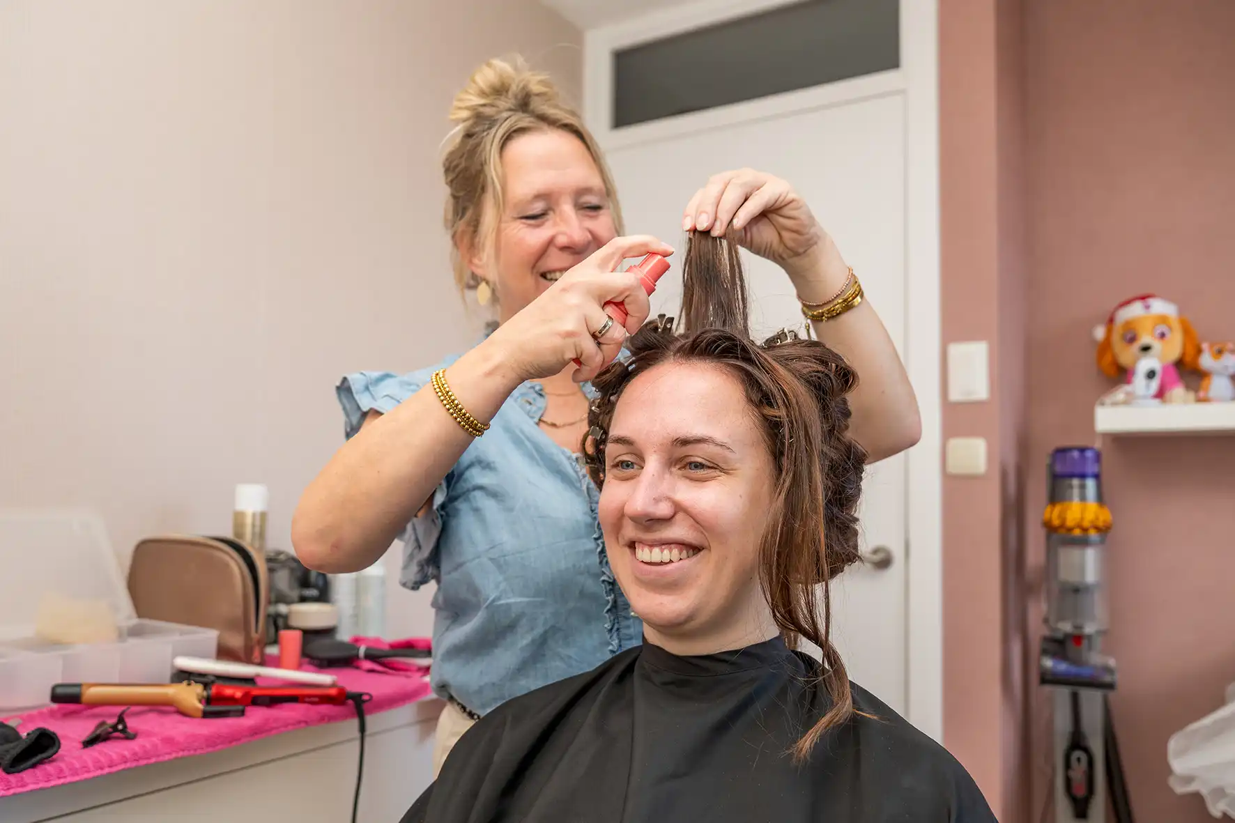 Terug bij Debby brak hét moment aan: de bruidsjurk aantrekken. Een intiem en ontroerend moment, altijd bijzonder om te mogen vastleggen.